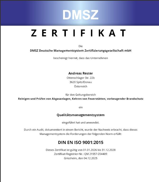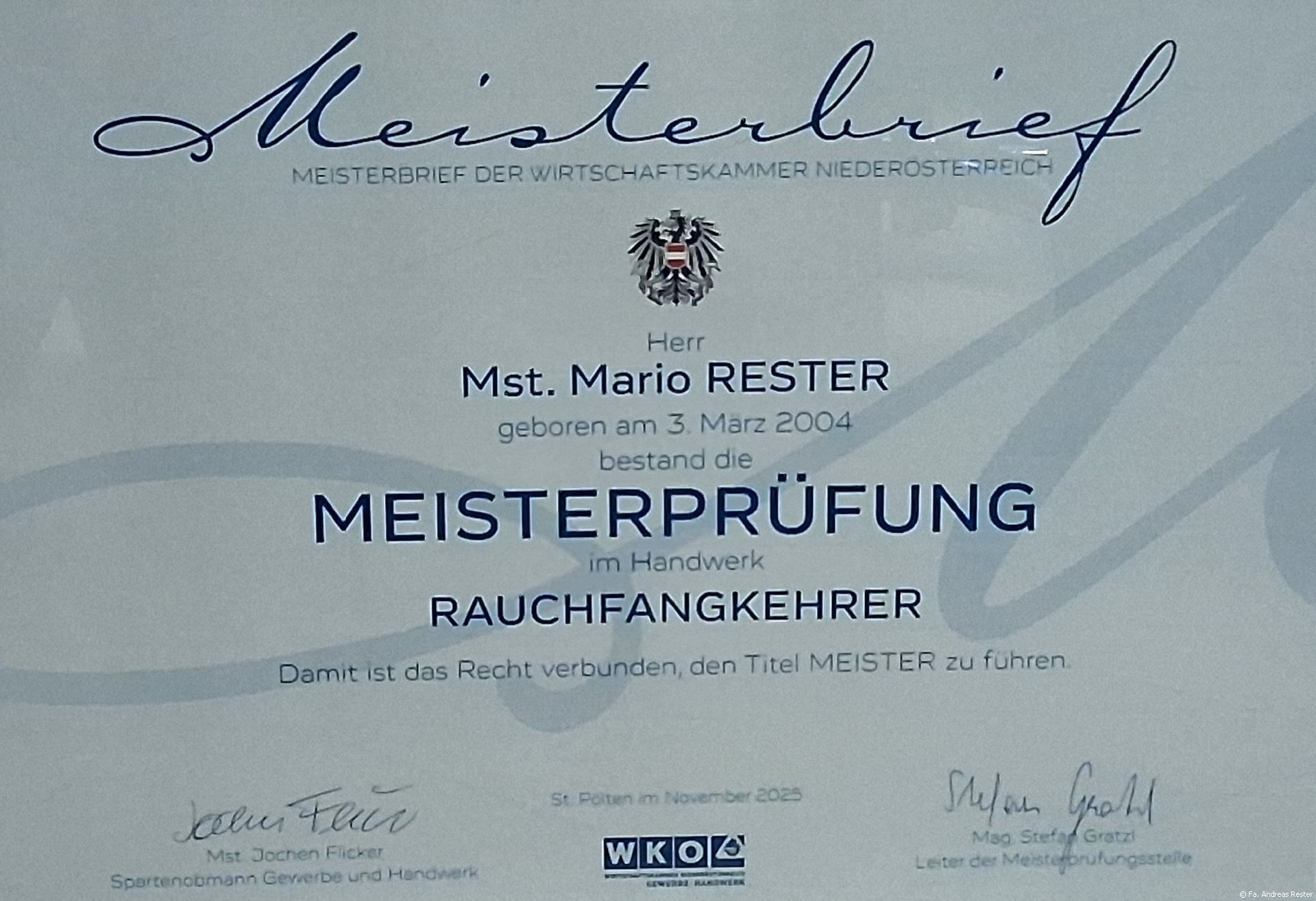 Mario Rester hat die Meisterprüfung für Rauchfangkehrer und die Unternehmerprüfung erfolgreich abgelegt und darf jetzt die Berufsbezeichnung "Meister" führen.